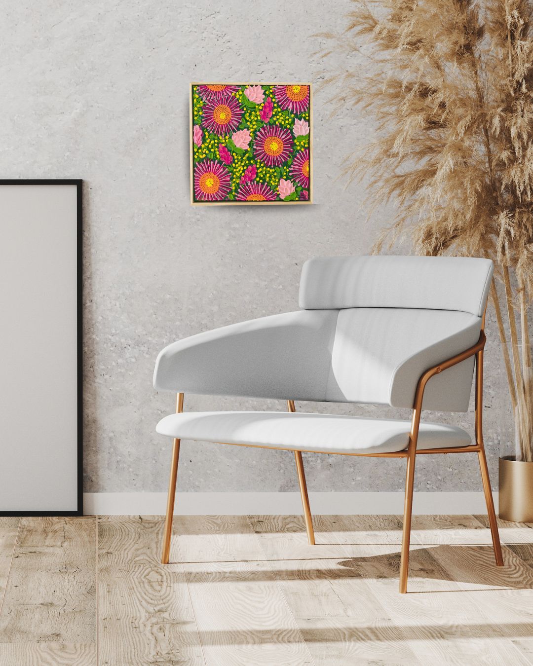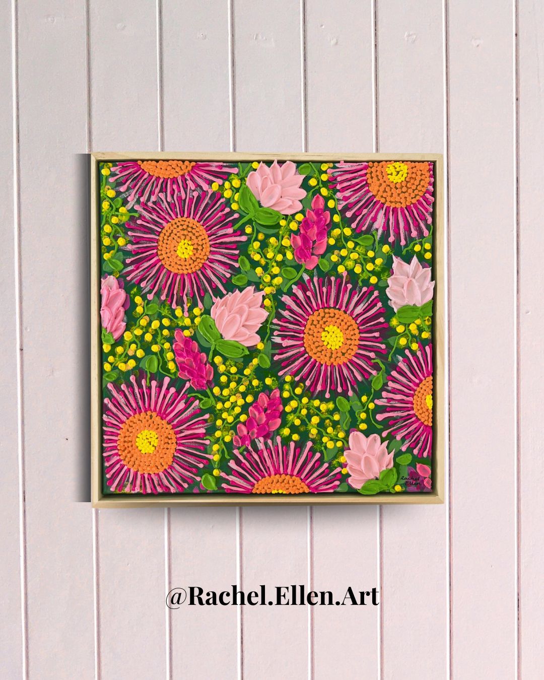 Featuring vibrant paper daisies and wattle, I created this piece to capture the essence of the Australian bush in all of its colourful glory.