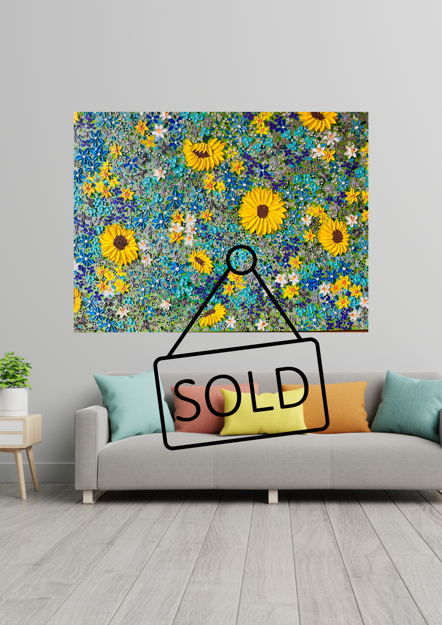 Featuring a scattering of vivid yellow sunflowers, bouncing daffodils and pops of blue and aqua.