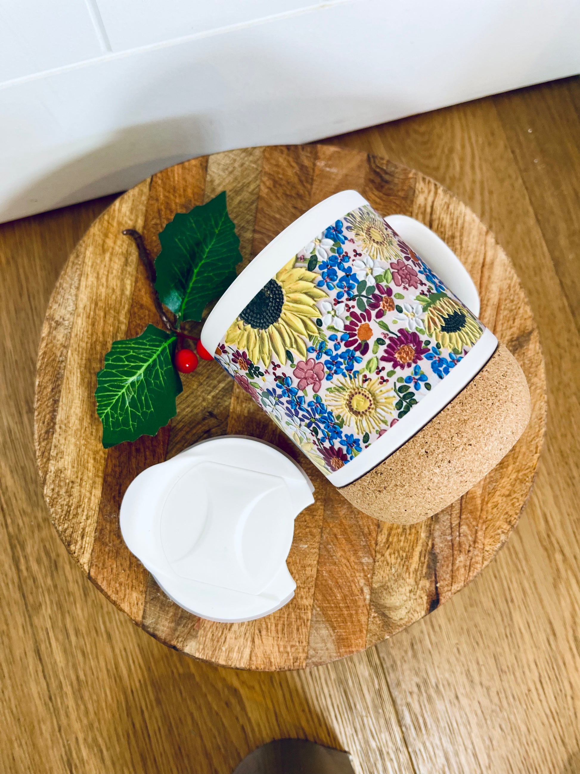 This mug features a removable cork base and lid - designed to keep warm drinks cosy.